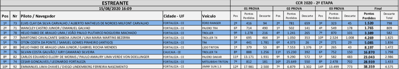 Nossa única dupla na Categoria Estreante mais uma vez subiu no pódio. Wancley Castro e Emanuel Galvão, chegaram em segundo lugar, com apenas 1.765 pontos perdidos, mesmo tendo sido atrapalhados por um bloqueio na via, feito por um caminhão. Tiveram apenas 245 pontos perdidos a mais que a dupla primeira colocada.