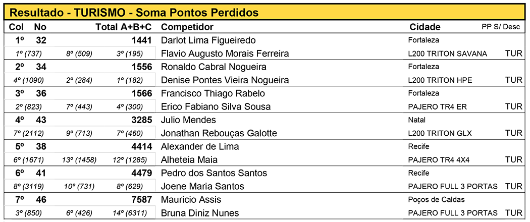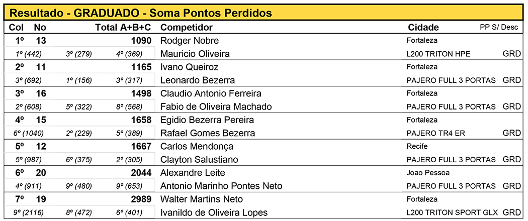 Nossa dupla na Categoria Graduados foi bem, apesar de não ter subido ao pódio, mas foi competitiva num espaço onde só existem feras do rally. Walter Martins e Ivanildo Lopes terminaram a etapa de João Pessoa na sétima colocação, com apenas 2.989 pontos perdidos.
