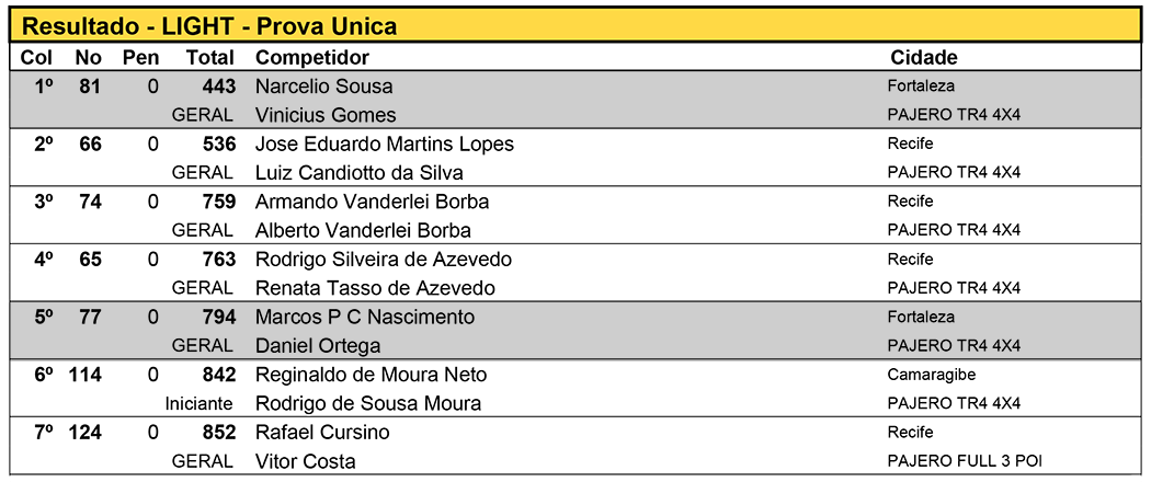 Na prova de Turismo Light tivemos ótimos resultados, com um destaque para a dupla José Narcélio e Vinicius Gomes, que subiu no lugar mais alto do pódio com apenas 443 pontos perdidos. Marcos Nascimento e Daniel Ortega, chegaram na 5ª posição, com 794 pontos perdidos, também subiram ao pódio. As duas duplas foram os únicos carros de Fortaleza no Top Ten da Turismo Light.